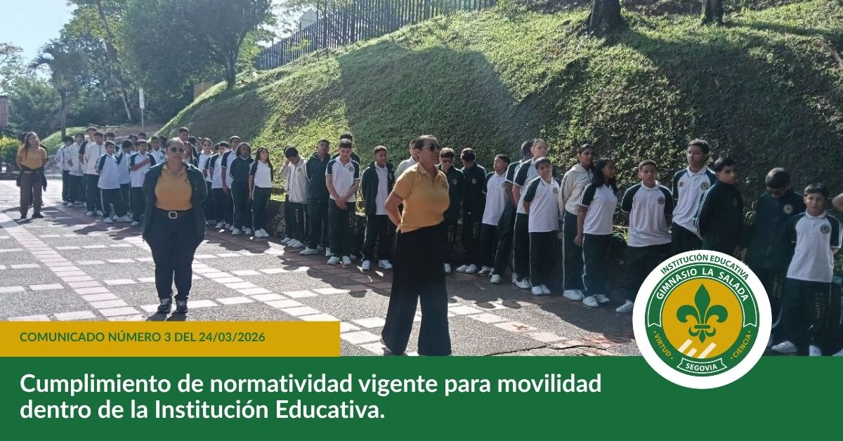 Socialización de propuesta de tarifas para el año lectivo 2026-2027Leer másLeer másCelebramos 77 años de historia, compromiso y transformación educativaLee la noticia Conoce nuestras noticias y comunicados Comunicados Cumplimiento de normatividad vigente para movilidad dentro de la Institución Educativa. Noticias Reunión previa a la presentación de las Pruebas ICFES SABER 11 Noticias Reapertura Biblioteca Escolar Comunicados Socialización de propuesta de tarifas para el año lectivo 2026-2027 Noticias Día Internacional de las Manos Rojas Noticias Olimpiadas Matemáticas Escríbenos secretaria@iegls.edu.co comunicaciones@iegls.edu.co Ubícanos Kilómetro 2, sector La Salada
