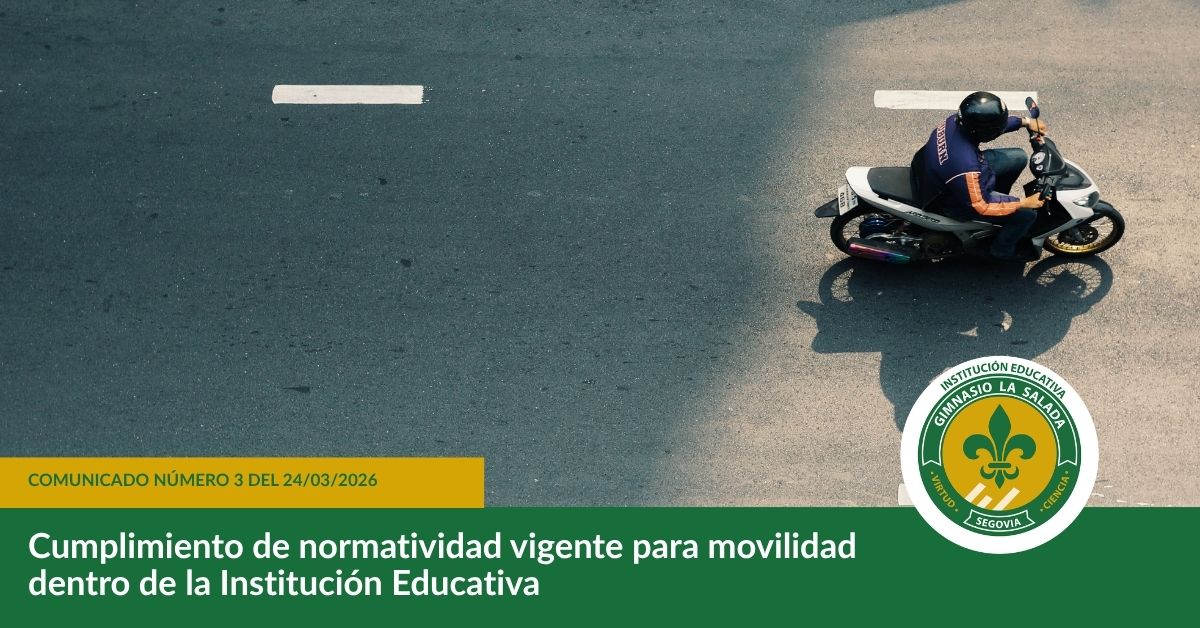 Por lo anterior, no se permitirá el ingreso a la institución de motocicletas conducidas por estudiantes, que no cuenten con la documentación exigida por la normativa vigente. Invitamos a las familias a acompañar y orientar a sus hijos en el cumplimiento de estas disposiciones, así como en la adopción de prácticas seguras en sus desplazamientos diarios.